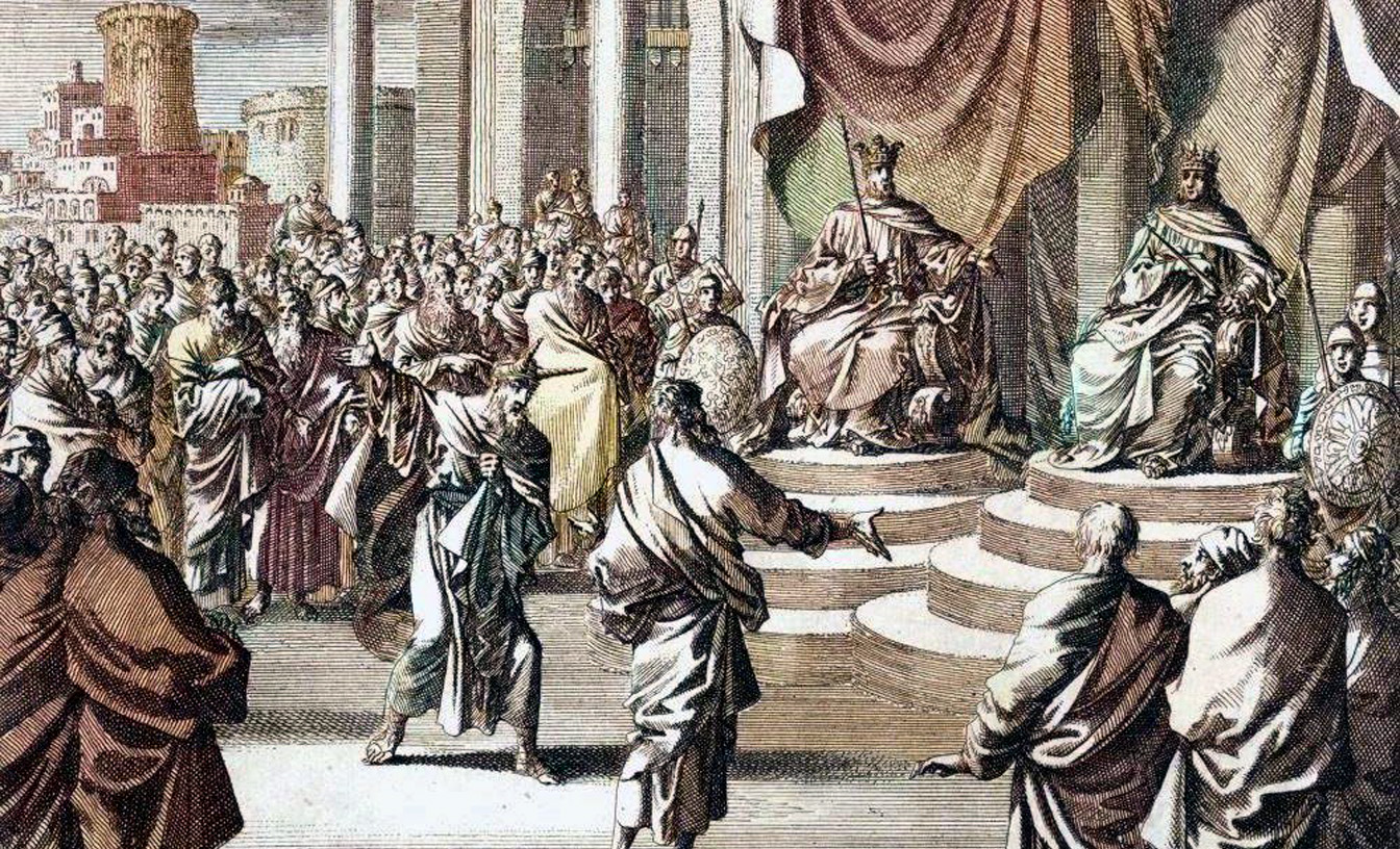 Micaiah and Zedekiah before King Ahab and King Jehoshaphat Engraving of a painting by Jan van Luyken, Rijksmuseum, Amsterdam